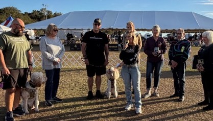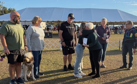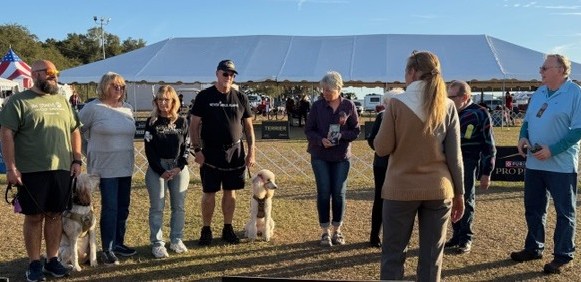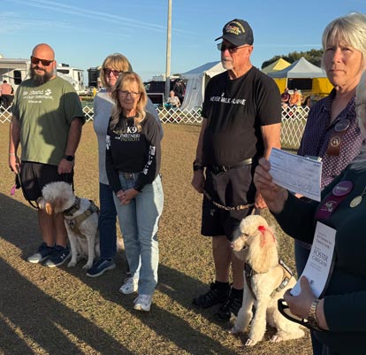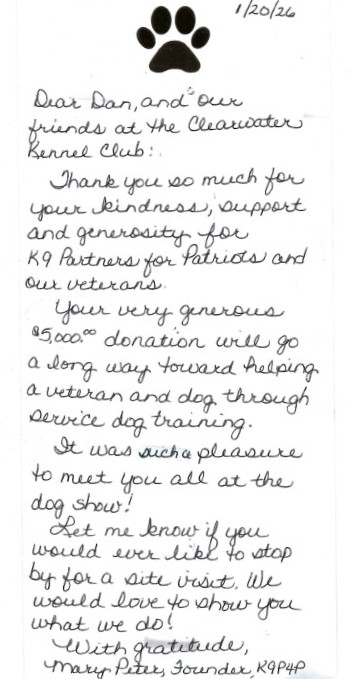 At the Florida Gulf Coast Cluster shows in January 2026, the Clearwater Kennel Club officers were able to present a $5000 donation check to the founder of the K9 Partners for Patriots, Mary Peter, along with a couple of the Veterans and their companion dogs.