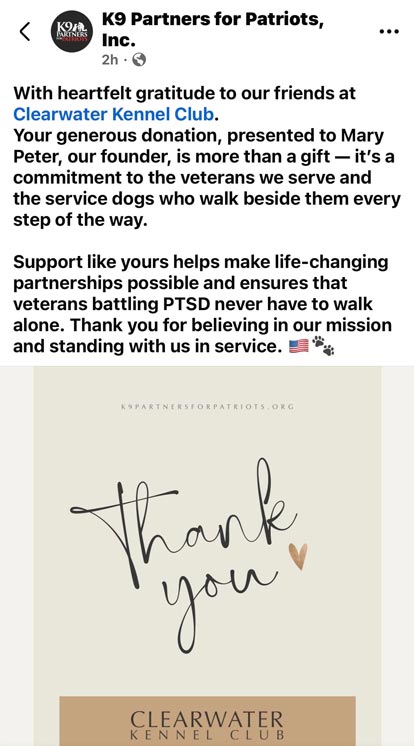 K9 Partners for Patriots expressed their appreciation to our Club both on their Facebook page and in a personal note.
